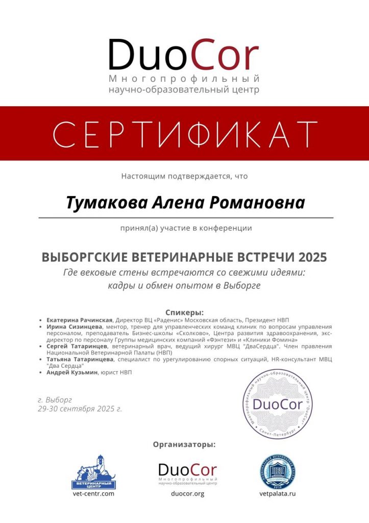 Алена Романовна работает в сети ветеринарных клиник «ВетСоюз» с апреля 2016 года. Она является постоянным участником профильных ветеринарных конференций, что позволяет ей оставаться в курсе последних достижений ветеринарии.